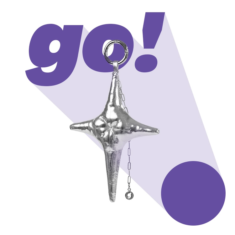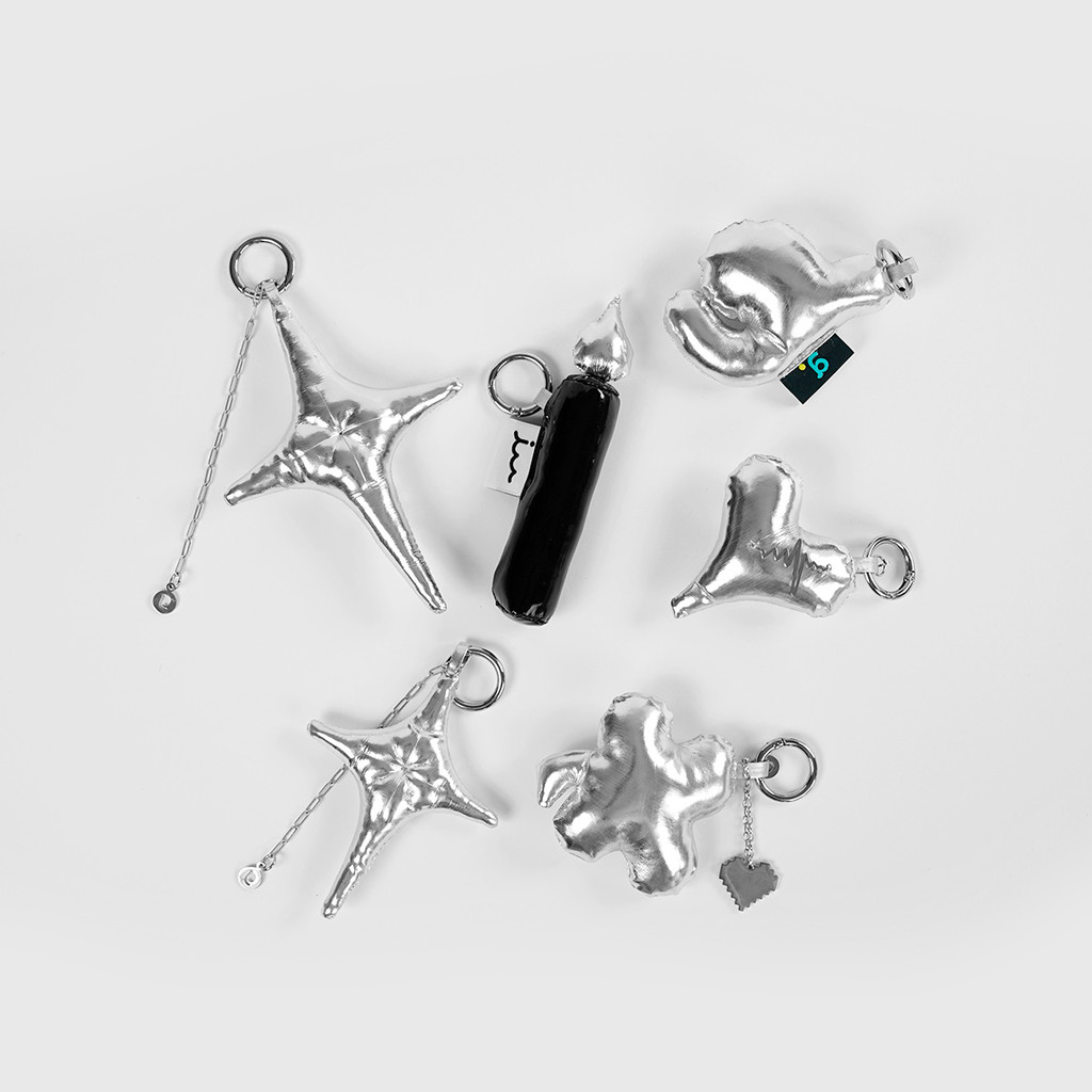 | 재질 | 실버 글로시 원단, 픽셀하트/체인/g로고 팬던트(서지컬), 솜(충전재) |